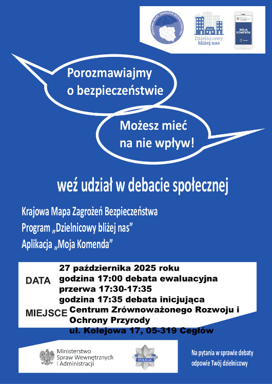 27 października 2025 roku zapraszamy mieszkańców miasta i gminy Cegłów do Centrum Zrównoważonego Rozwoju i Ochrony Przyrody przy ul. Kolejowej 17 na debaty społeczne. Komendant Powiatowy Policji zaprasza na spotkania dotyczące bezpieczeństwa i porządku publicznego, a także bezpieczeństwa osób starszych. Najpierw o godz. 17:00 odbędzie się debata społeczna ewaluacyjna, podczas której omówione zostaną postulaty i wnioski zgłoszone podczas spotkania w ubiegłym roku. Następnie po krótkiej przerwie o godz. 17:35 odbędzie się debata społeczna inicjująca poświęcona bezpieczeństwu seniorów.
