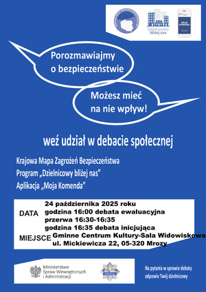 ZAPRASZAMY NA DEBATY SPOŁECZNE MIESZKAŃCÓW MIASTA I GMINY MROZY ,,POROZMAWIAJMY O BEZPIECZEŃSTWIE”