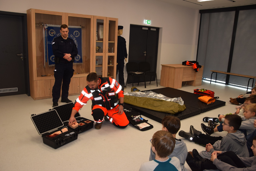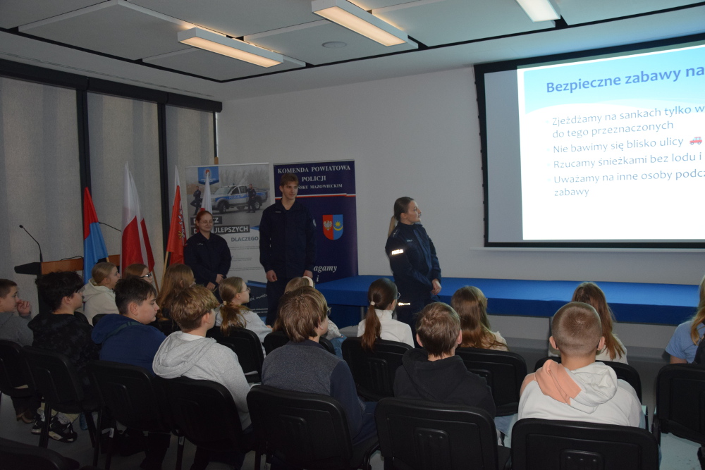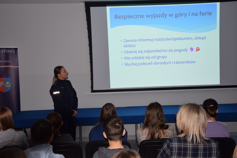 Piknik rozpoczął się od wykładu profilaktycznego, który przeprowadziła młodszy aspirant Emilia Chilczuk z Wydziału ds. Wykroczeń, Nieletnich i Patologii. Policjantka omówiła najczęstsze zagrożenia występujące podczas zimowych ferii, zwracając szczególną uwagę na bezpieczeństwo podczas zabaw na świeżym powietrzu, korzystania z lodowisk oraz niebezpieczeństwa związane z wchodzeniem na zamarznięte zbiorniki wodne. Uczniowie dowiedzieli się również, jak unikać ryzykownych zachowań oraz w jaki sposób prawidłowo reagować w sytuacjach zagrożenia.