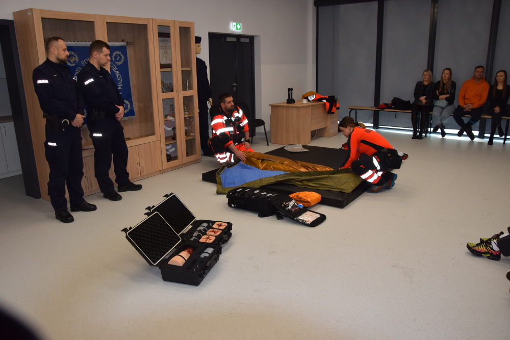 Kolejnym punktem programu były zajęcia z zakresu pierwszej pomocy przedmedycznej. Szkolenie przeprowadził Grzegorz Owsiak, ratownik medyczny z Ochotniczej Straży Pożarnej w Ładzyniu. Podczas warsztatów młodzież mogła zapoznać się z podstawowymi zasadami udzielania pierwszej pomocy, w tym z prawidłowym tamowaniem krwotoków, opatrywaniem ran oraz właściwym postępowaniem w przypadku nagłych zdarzeń zagrażających zdrowiu lub życiu. Zajęcia miały charakter praktyczny, co pozwoliło uczestnikom aktywnie w nich uczestniczyć.