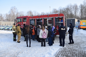 Następnie uczniowie udali się na dziedziniec komendy, gdzie przygotowano stanowiska pokazowe służb mundurowych i ratowniczych. Młodzież miała możliwość obejrzenia specjalistycznego pojazdu Wydziału Ruchu Drogowego Komendy Powiatowej Policji w Mińsku Mazowieckim. Wyposażenie oraz zadania do jakich jest wykorzystywany sprzęt, przedstawił sierżant sztabowy Kacper Proczka. Policjant przybliżył również specyfikę służby w ruchu drogowym oraz znaczenie przestrzegania przepisów na drodze.