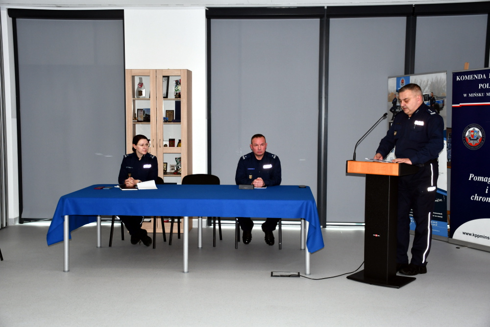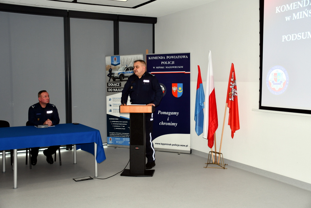 Następnie Zastępca Komendanta Powiatowego Policji w Mińsku Mazowieckim podinsp. Artur Pasztaleniec omówił efekty pracy pionu prewencyjnego. Przedstawił liczbę przeprowadzonych interwencji oraz działania realizowane na podstawie zgłoszenia nanoszone na Krajową Mapę Zagrożeń Bezpieczeństwa. Zaprezentował dane dotyczące liczby zatrzymanych sprawców przestępstw oraz omówił służbę dzielnicowych, wskazując na realizowane przez nich czynności, obchody rejonów służbowych, spotkania z mieszkańcami oraz działania profilaktyczne. Podinsp. Artur Pasztaleniec przedstawił również działalność Wydziału do spraw Wykroczeń, Nieletnich i Patologii. Omówił liczbę prowadzonych czynności wyjaśniających w sprawach o wykroczenia, a także działania podejmowane wobec osób nieletnich przejawiających demoralizację lub dopuszczających się czynów karalnych. Zaprezentował dane dotyczące przestępczości nieletnich na terenie powiatu mińskiego, wskazując na skalę zjawiska oraz podejmowane działania profilaktyczne i interwencyjne. W dalszej części omówiony został stan bezpieczeństwa w ruchu drogowym na terenie powiatu mińskiego. Przedstawiono liczbę zdarzeń drogowych, działania kontrolne prowadzone przez policjantów ruchu drogowego oraz inicjatywy mające na celu poprawę bezpieczeństwa wszystkich uczestników ruchu.