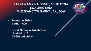 16 marca 2026 roku Komendant Powiatowy Policji w Mińsku Mazowieckim zaprasza mieszkańców gminy Jakubów na debatę społeczną ewaluacyjną, która odbędzie się w Urzędzie Gminy w Jakubowie przy ul. Mińskiej 15.